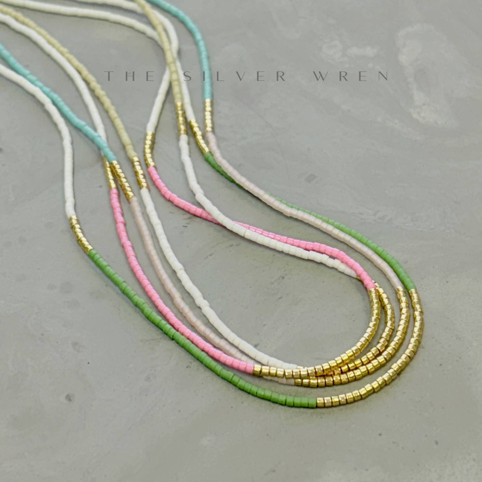 Our lithe necklace is handcrafted with a touch of gold in a minimalist style. •Seed beads in a beautiful color combination •Hand strung in a modern pattern •14kt Gold-Filled beads & spring clasp •16 inch in length with an optional 2 inch extender