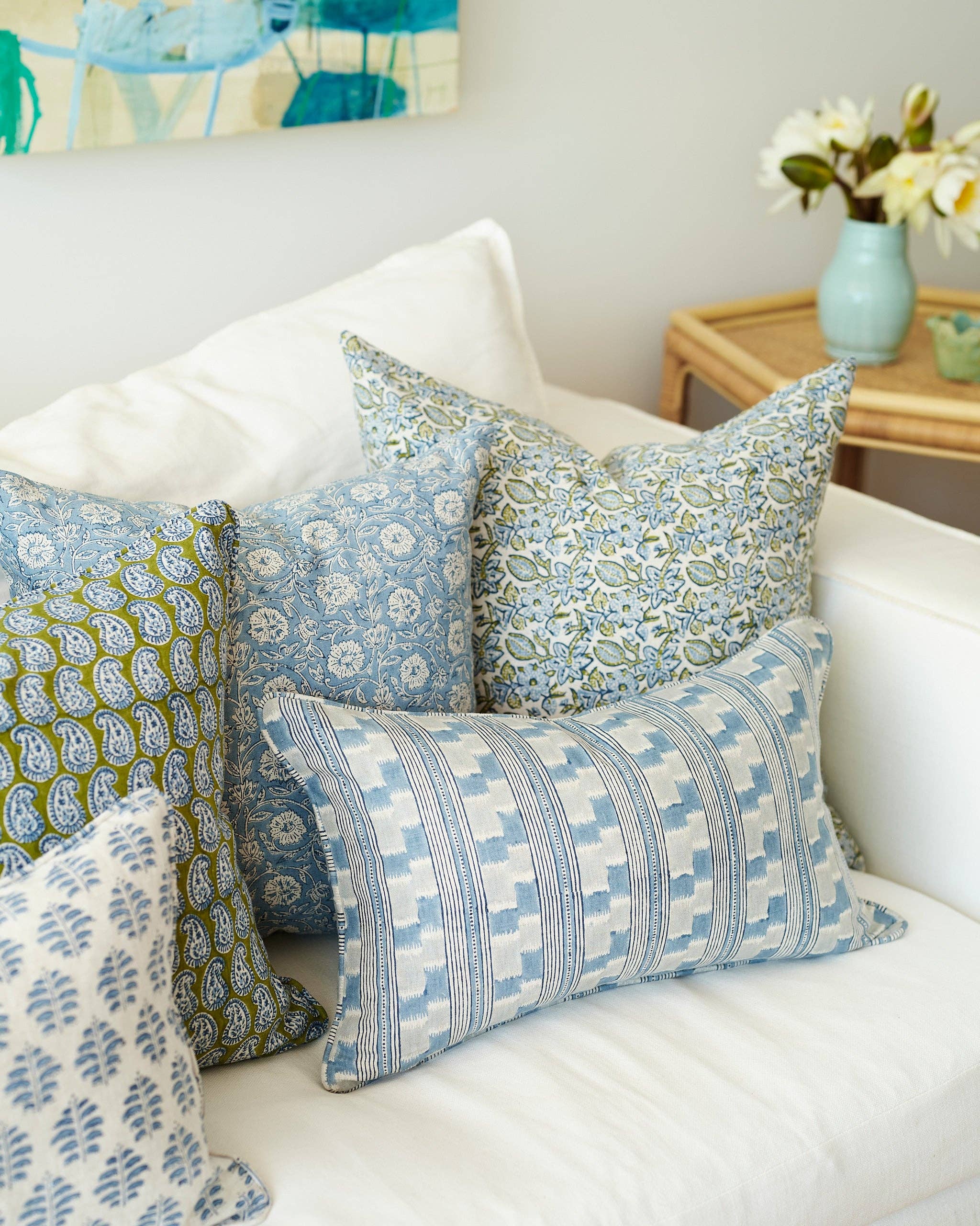 Simrane is a sumptuous paisley design which looks divine in almost any colourway! Bring your favourite colour palette into your space with this cushion, hand block printed by skilled artisans in India. * 50cm x 50cm / 20" x 20" * Pipe edge finish * 100% linen with feather insert included. CARE INSTRUCTIONS: Cold machine wash separately on a delicate cycle with a very minimal amount of mild detergent. Do not tumble dry, soak or bleach. Iron at medium setting if necessary. For spot cleaning, gently dab the area with water (do not rub). Due to the nature of hand printed fabrics, variation in colour and pattern may occur. Keep out of direct sunlight to avoid excessive fading.